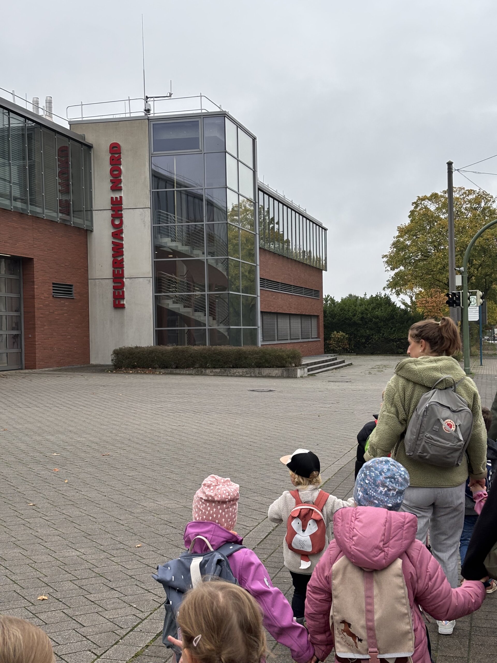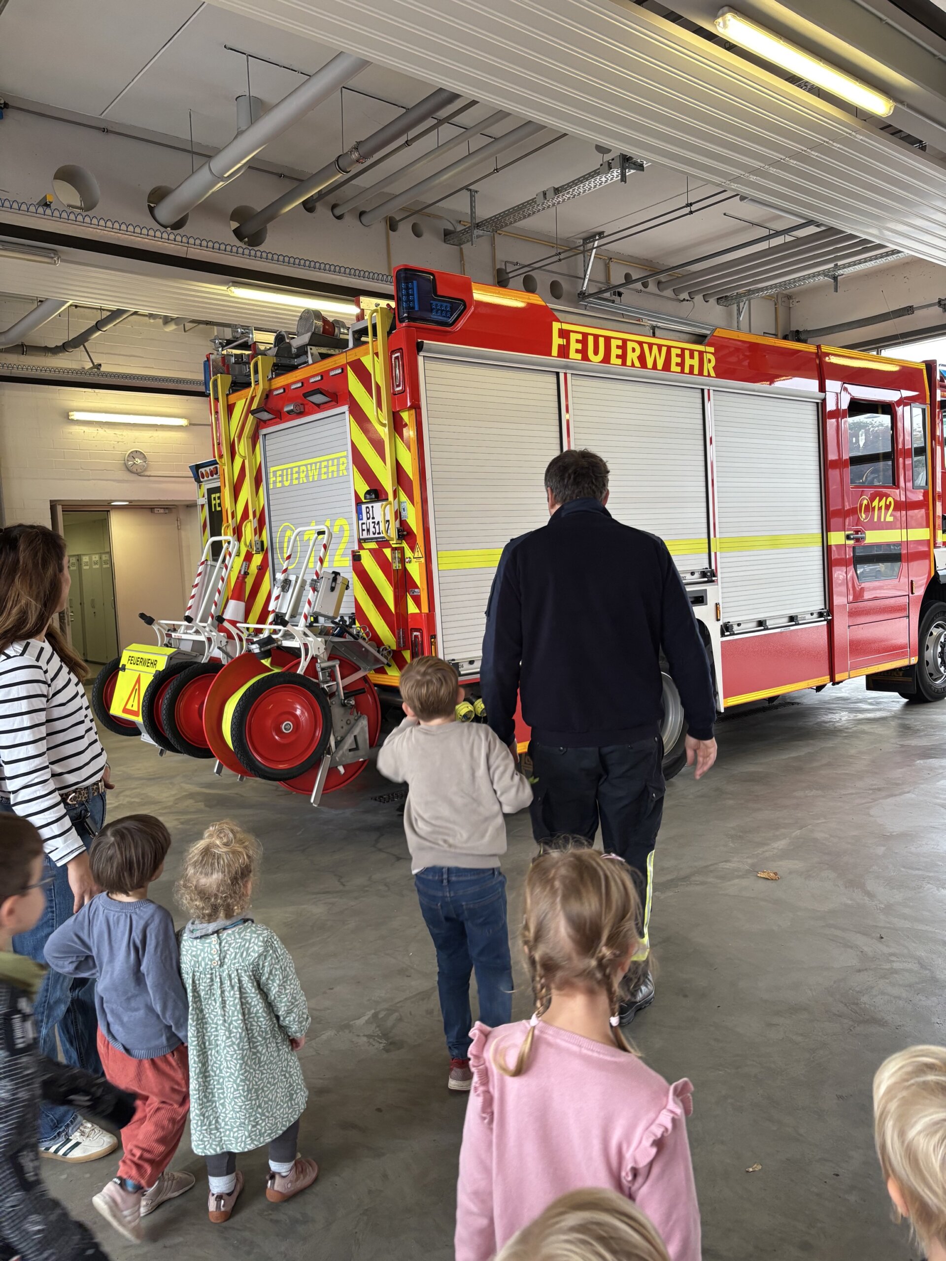 Die Ü3 Kinder der Kita „Am Herrengarten“ haben die Feuerwehrwache Nord besucht. Vor unserem Ausflug haben wir aus Papptellern Feuerwehrhelme gebastelt. Vor Ort haben wir uns zum Bespiel einen Rettungswagen und ein großes Feuerwehrauto angesehen. Die Kinder durften im Feuerwehrauto probe sitzen, einen Teil vom Feuerwehrschlauch halten und haben beobachtet, wie hoch die Drehleiter fahren kann. Ein aufregender Tag geht zu Ende und wir haben jetzt ganz viele Kinder mit einem neuen Berufswunsch.