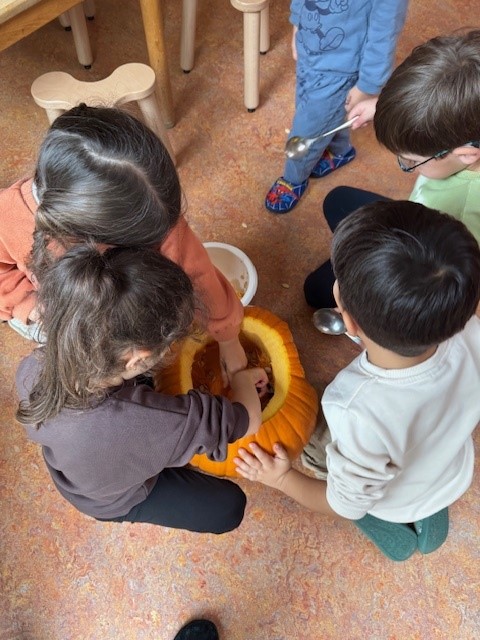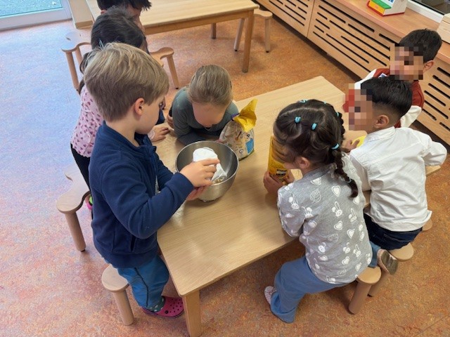 Der Apfel besteht aus einem Kerngehäuse, dort befinden sich die Apfelkerne, aus denen man neue Apfelbäume ziehen kann. Ganz oben am Apfel hängt der Stiel, der den Apfel mit dem Baum oder dem Ast verbindet. Unter der Schale des Apfels befinden sich die meisten Vitamine, daher ist es am Gesündesten, wenn man den Apfel mit der Schale ist. Nachdem wir den Apfel genauer untersucht haben, haben wir den Apfel entkernt, geschnitten und mit Hilfe des Entsafters entsaftet. Aus dem übrig gebliebenen Trester (feste Rückstände des Apfels) haben wir einen Apfel- Haferflocken- Teig für Pfannkuchen gemischt und anschließend für den Snack kleine Pfannkuchen gebacken. Den Apfelsaft gab es zum Mittagessen, er war herrlich erfrischen und zuckersüß.